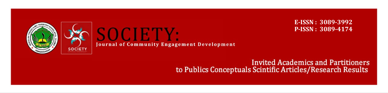 Society: Community Engagement and Sustainable Development (E-ISSN: 3089-3992 P-ISSN: 3089-4174) Publised twice a year (march and september) is peer-reviewed international journal published biannually by the Lembaga Penelitian dan Pengabdian Kepada Masyarakat (LPPM), Sekolah Tinggi Ilmu Tarbiyah Nahdlatul Ulama Al Farabi Pangandaran Indonesia.The aim of this journal publication is to disseminate the conceptual thoughts or ideas and research results that have been achieved in the area of community services. Jurnal Pengabdian kepada Masyarakat (Indonesian Journal of Community Engagement), particularly focuses on the main problems in the development of the sciences of community services areas as follows: Community Services, People, Local Food Security; Training, Marketing, Appropriate Technology, Design; Community Empowerment, Social Access; Student Community Services; Border Region, Less Developed Region; Education for Sustainable Development. This journal is an open access journal which means that all content is freely available without charge to the user or his/her institution. Users are allowed to read, download, copy, distribute, print, search, or link to the full texts of the articles, or use them for any other lawful purpose, without asking prior permission from the publisher or the author.